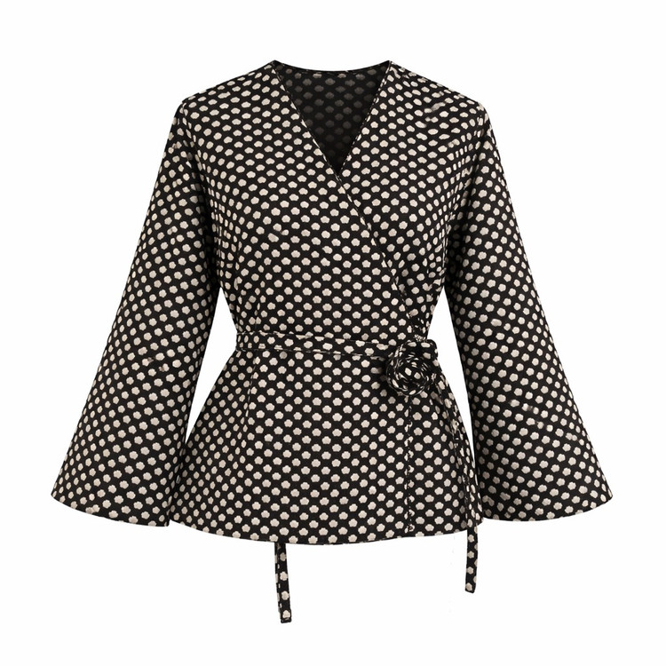 کت ژاکارد یکطرفه با سجاف مروارید دوزی و طرح لنگی گرهی و قواره دار به همراه یک عدد کمر تزءینی به شکل طرح گل رز با قد حدودا 70 سانت