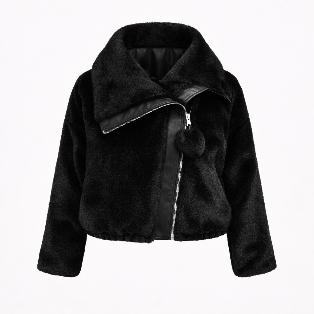 کاپشن خزدار کوتاه با جنس خز پرزدار کوتاه یقه بزرگ (دراپه - شالی - اسکی) مانند فری سایز در دو رنگ مشکی و موشی