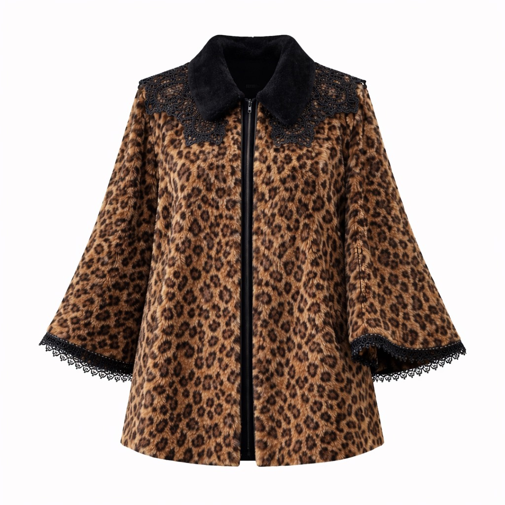 پالتو پوست پلنگی یقه وآستین دانتل مزونی فری سایز (مناسب 36 تا 48)